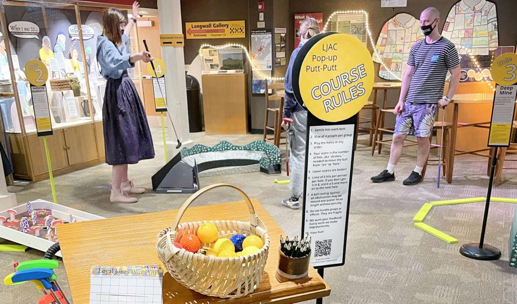 When the pandemic hit, LJAC turned its focus towards student support and experiences. The putt-putt-as-interactive-exhibit concept came back to life. The studio buzzed with activity as Miller and two student curators made it real. We researched indoor mini-golf, found suppliers, brainstormed themes, and built mockups. We iteratively improved our designs through pop-up testing with real golfers in the gallery and a soft-opening in December 2021. Interpretive signs connect golfing to nuggets of Appalachian studies content.